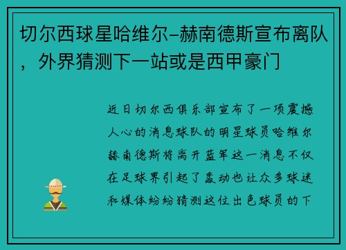 近日,切尔西俱乐部宣布了一项震撼人心的消息——球队的明星球员哈维尔-赫南德斯将离开蓝军。这一消息不仅在足球界引起了轰动,也让众多球迷和媒体纷纷猜测这位出色球员的下一站会是哪里。赫南德斯在切尔西的表现一直备受瞩目,他的离开无疑将对球队产生重要影响,同时也为他下一步的职业生涯增添了无限悬念。